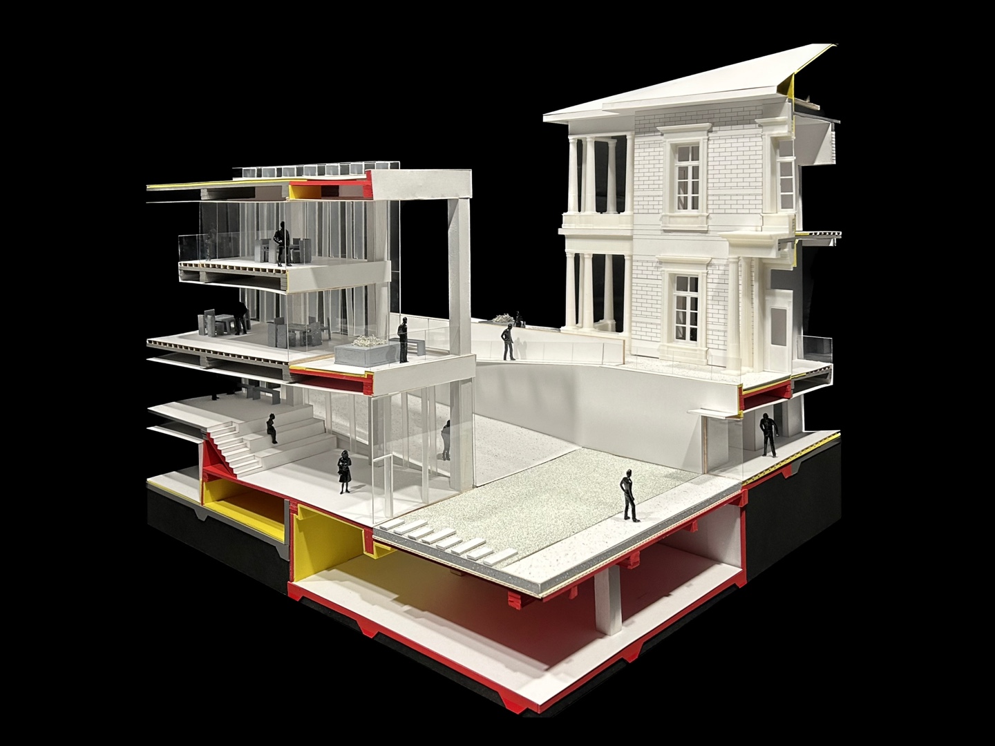 이때 트레이싱지를 활용하면 조금 더 쉽게 마감할 수 있는데, 바로 모형의 입면에 트레이싱지를 대고 개구부 모양대로 본따서 그린 후 재료 위에 트레이싱지를 붙여서 대고 자르는 것이다. 여전히 귀찮기는 하지만 조금 더 편하고 빠르게 개구부를 뚫을 수 있다.